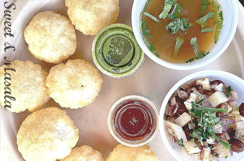 A common Indian street food. It consists of a round, hollow puri, fried crisp and filled with a mixture of flavored water, tamarind chutney, chili, chaat masala, potato, onion and chickpeas.