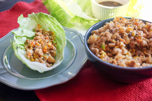 In addition to the ground turkey I like to add a schomorgus board off veggies; carrots, corn, water chestnuts, onions…think of the lettuce wrap as holder for anything you want! There are no rules here.